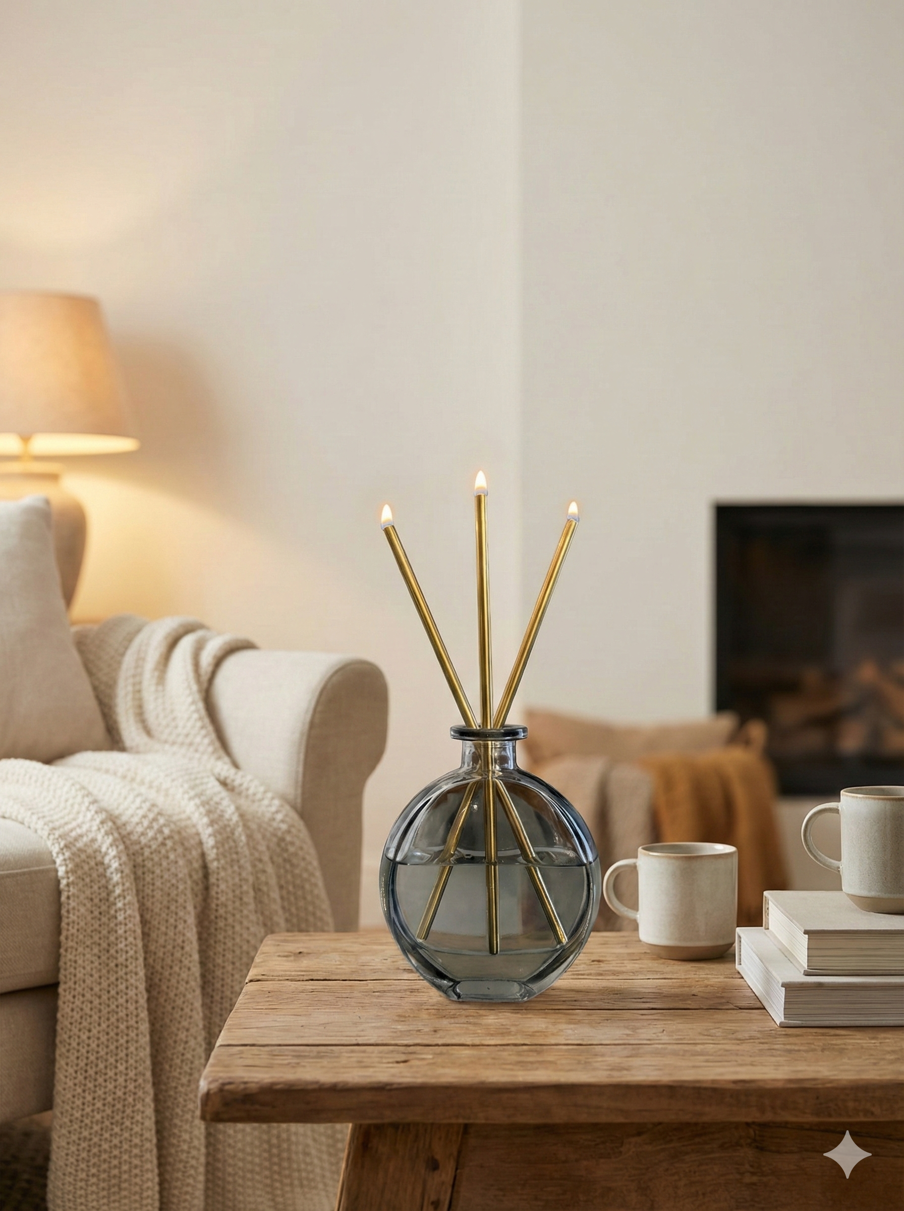 Pour approximately three inches of Lumora Oil®️ into your vase using the black steel funnel provided. Insert the wicks gently into the vase. First-time use only: Soak each side of the wick for 20 minutes for a perfect, even flame. Light, unwind, and let your space glow endlessly.