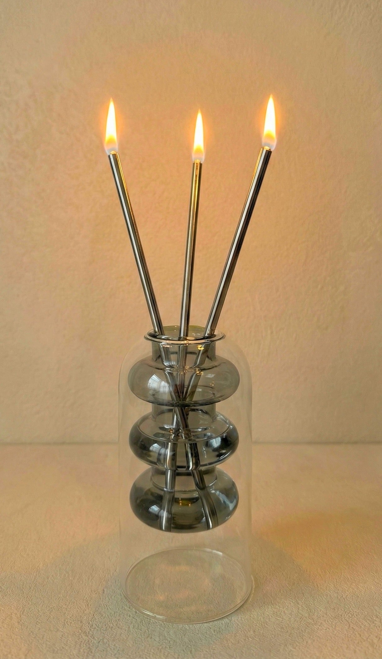 The Muse vase is a study in form and balance, a sculptural three-tiered design that evokes creativity and calm. With its smoked glass curves and soft endless glow, Muse transforms stillness into art, creating an atmosphere of reflection and beauty. Designed to burn without wax or smoke, it stands as a symbol of quiet luxury.