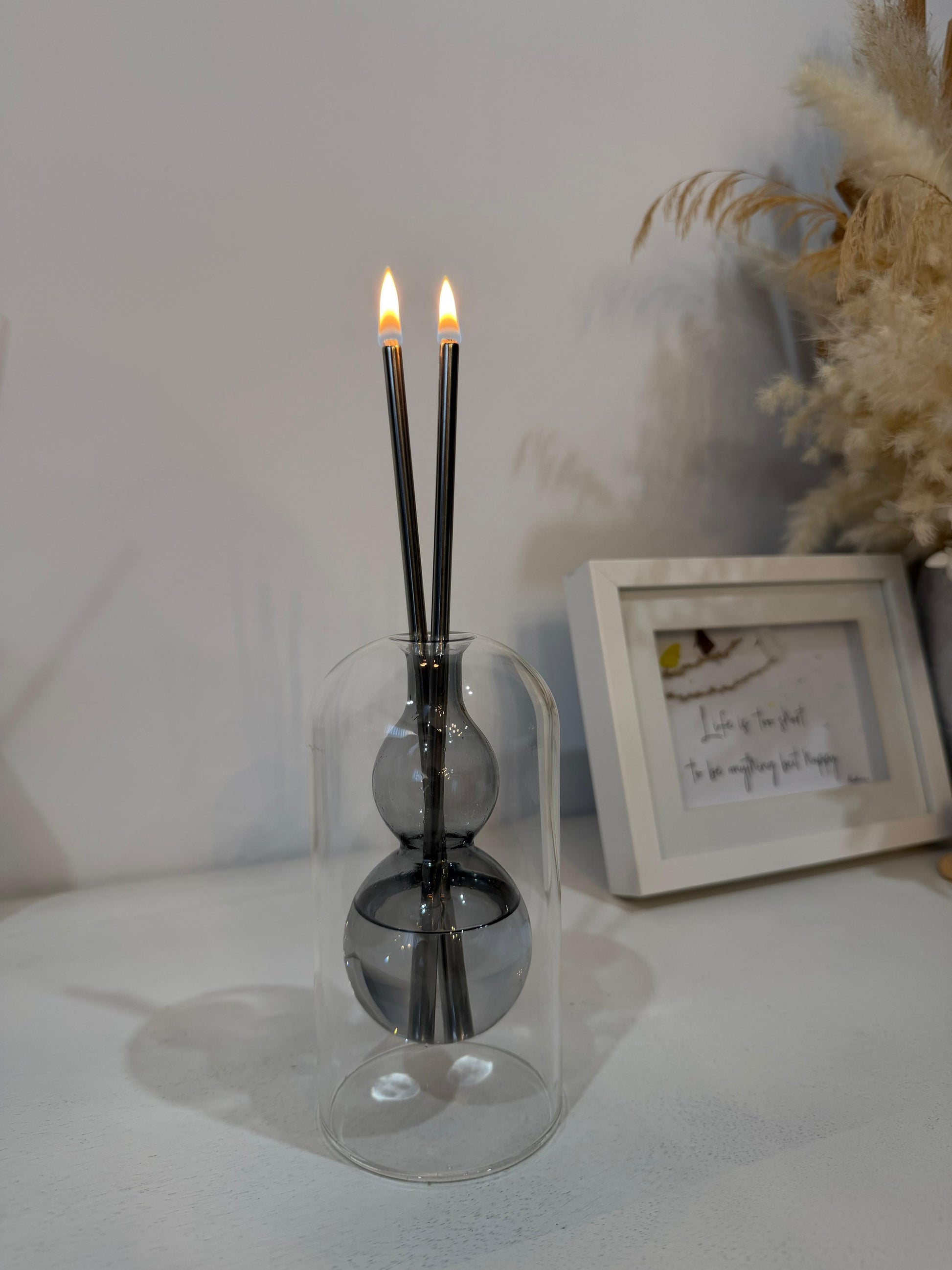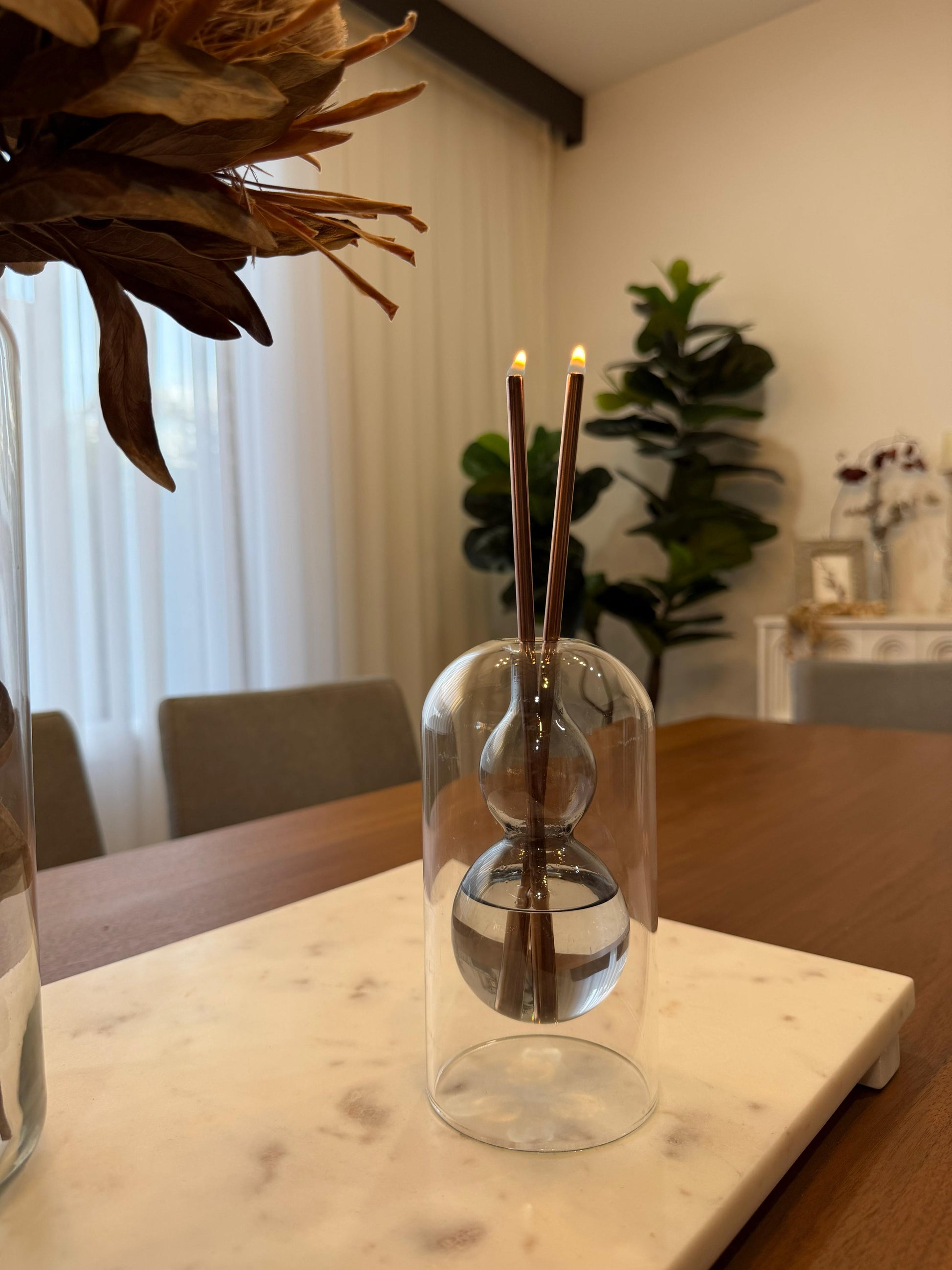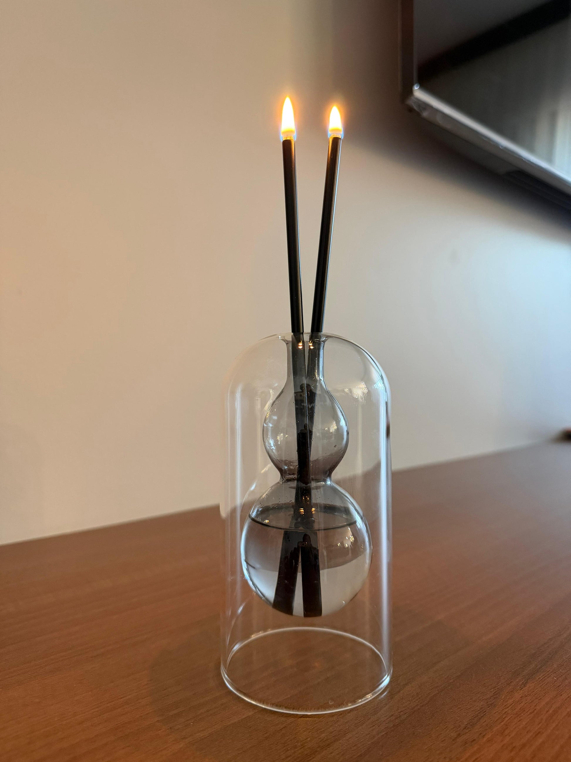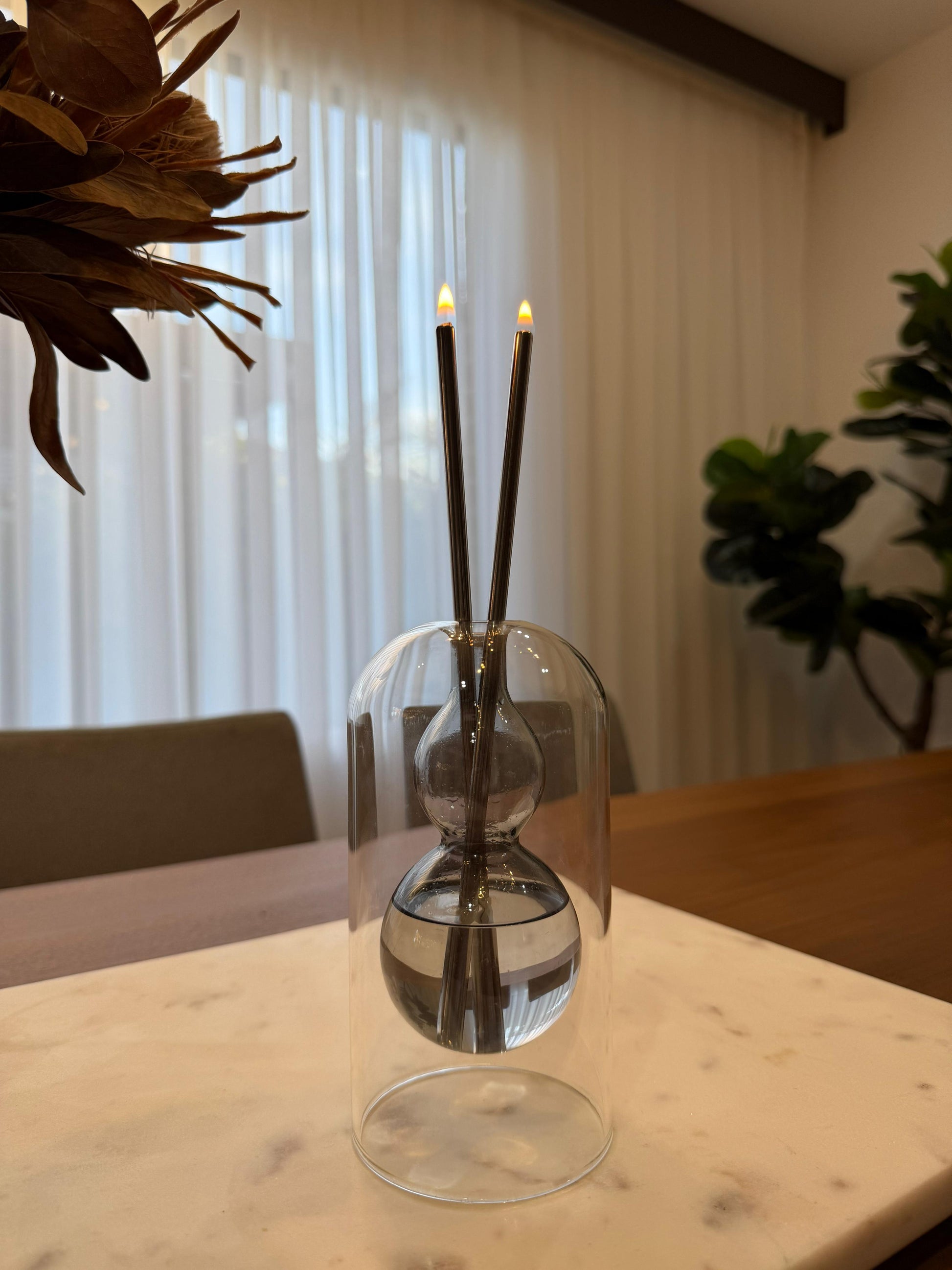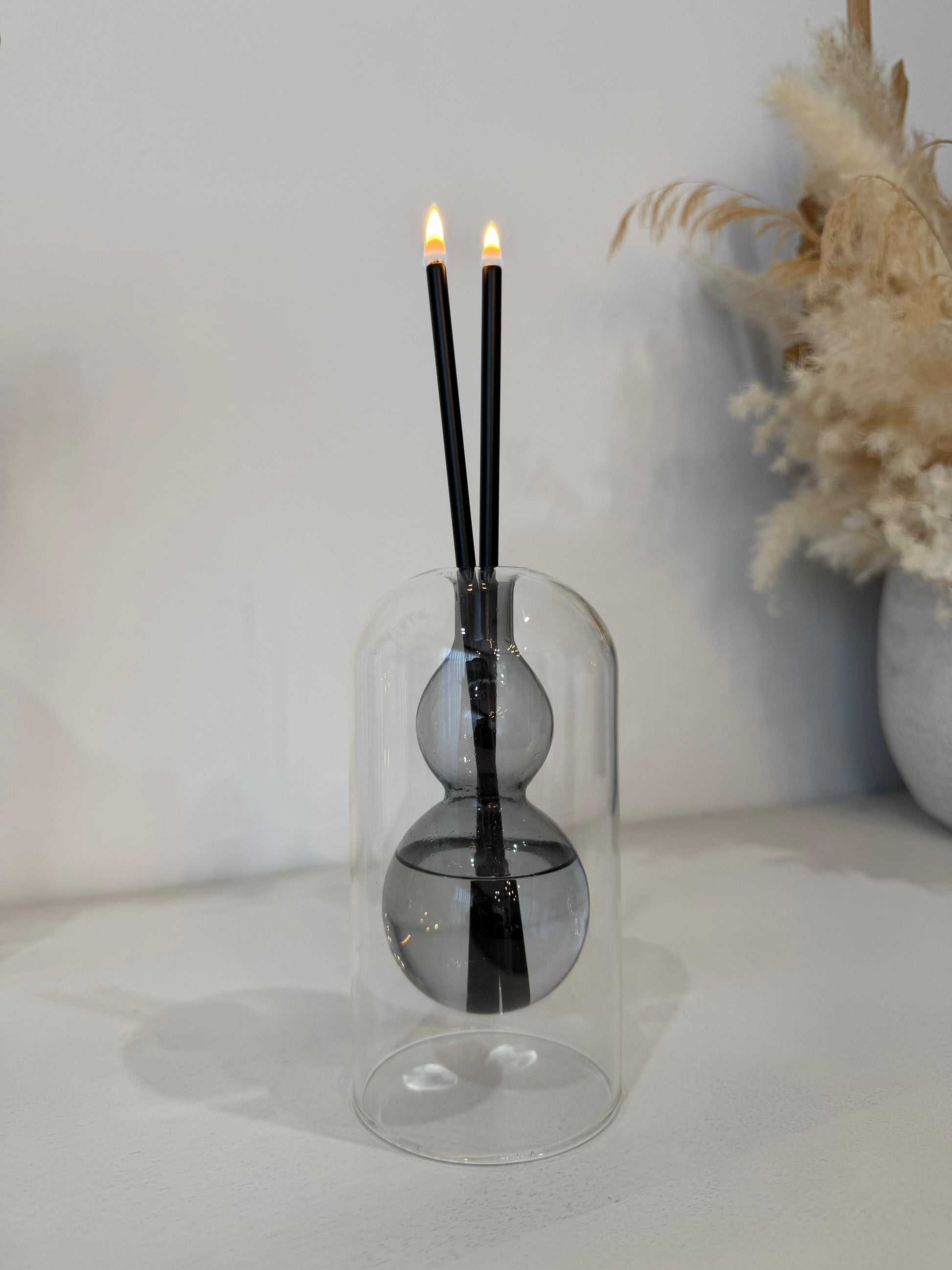 Sculptural and serene, the Vanta vase captures the allure of contrast — deep smoky glass rising into a dome of clarity, illuminated by golden wicks that burn endlessly without melting. This piece embodies Esméa’s modern design philosophy: simplicity refined to its most elegant form.